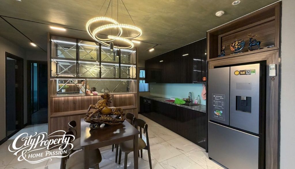 Khi phân tích layout empire city, bạn cần chú ý đến khu vực bếp. Đa số các thiết kế căn hộ empire city 2 phòng ngủ tại phân khu Linden và Tilia có bếp kín hoặc bếp có thể ngăn cách bằng kính để tránh mùi ám vào phòng khách. Loggia phơi đồ luôn được đặt cạnh bếp, tạo sự thuận tiện trong sinh hoạt hàng đầu.