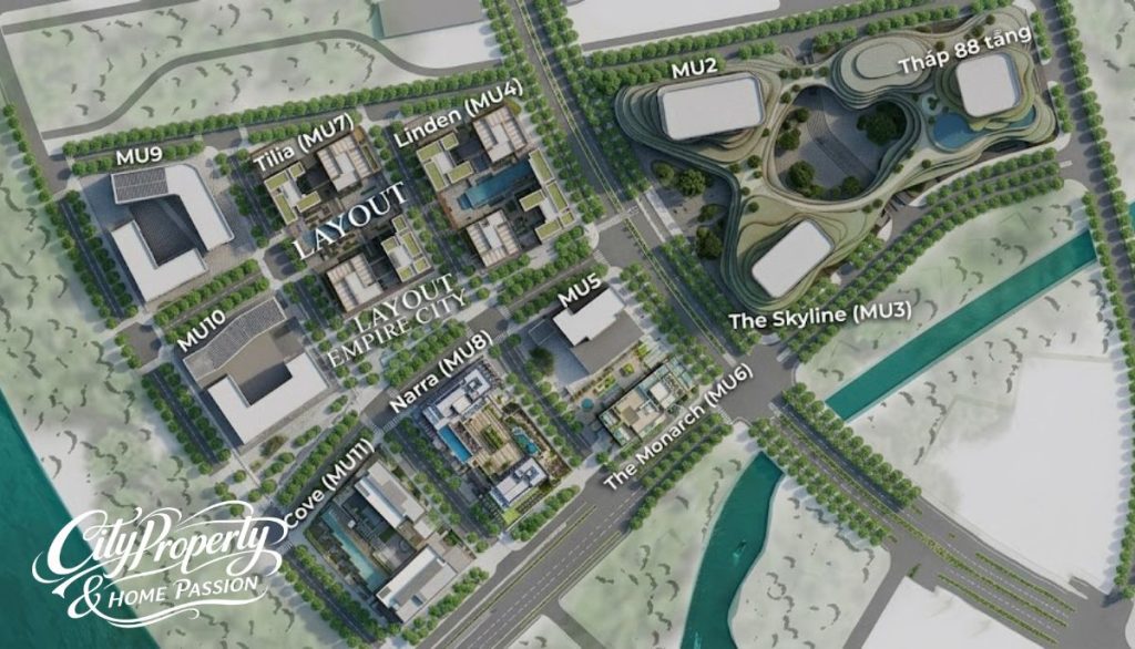 Các phân khu tại dự án được ký hiệu bằng mã MU (Mixed Use) từ MU1 đến MU11. Sơ đồ tòa nhà empire city ven sông thể hiện sự ưu tiên cho các khu thấp tầng tại sát mép nước và cao dần về phía sau. Cách bố trí này tạo ra một diện mạo kiến trúc nhấp nhô, tối ưu hóa gió và ánh sáng cho toàn bộ mặt bằng căn hộ empire city.