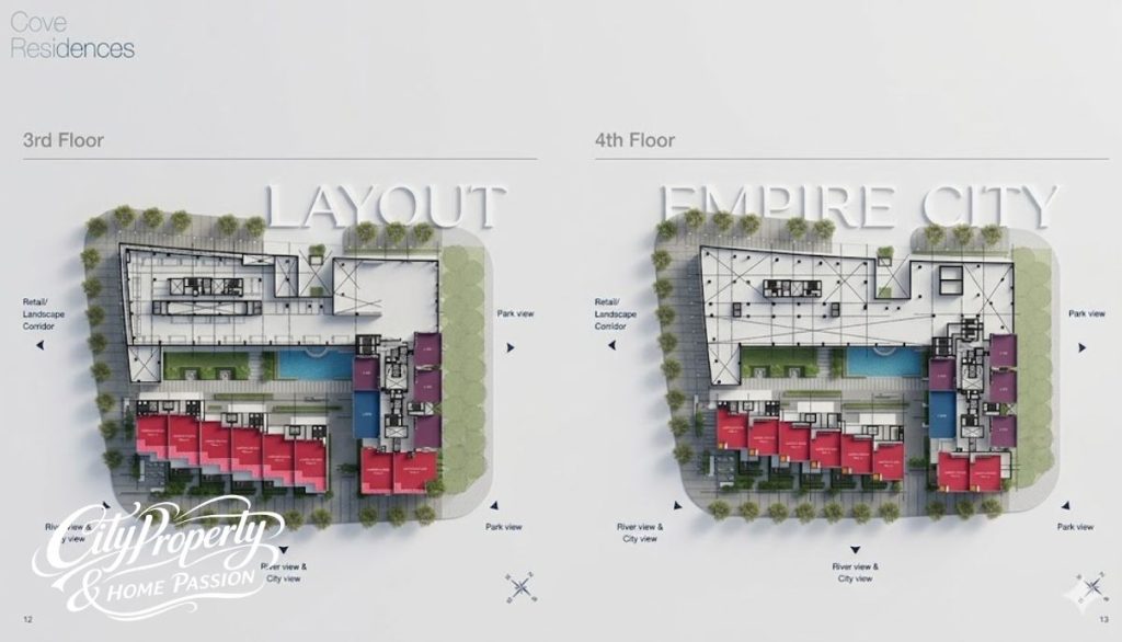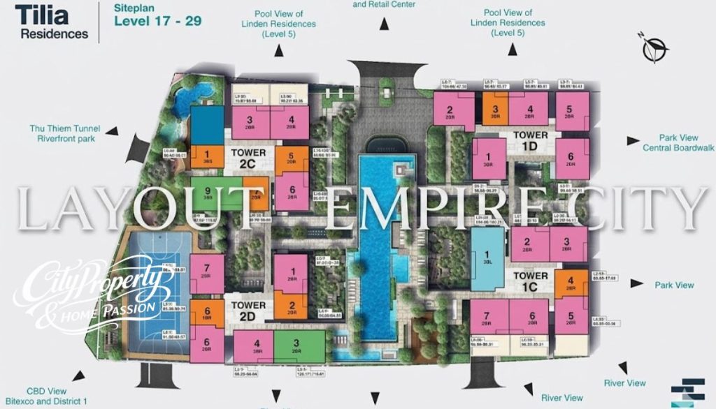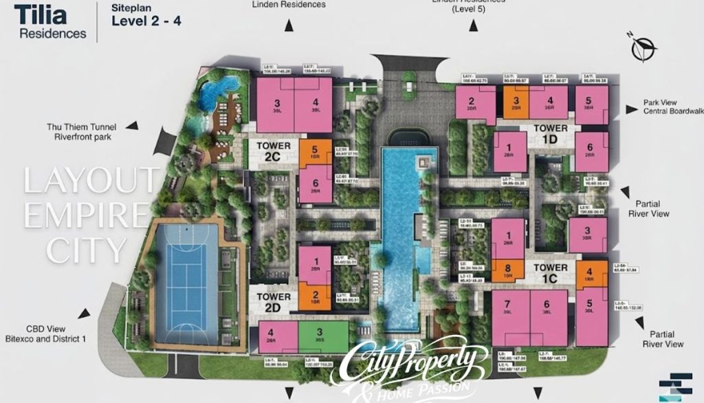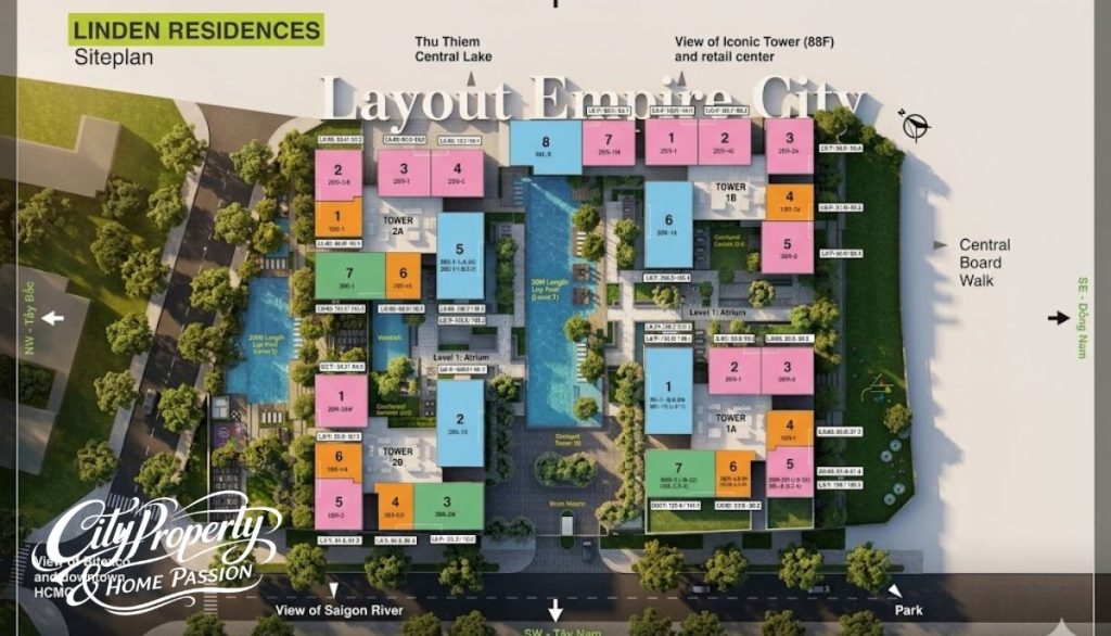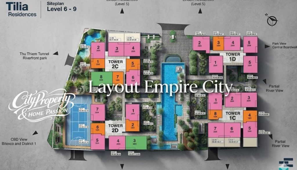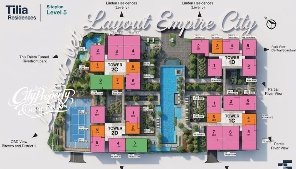 Layout các phân khu căn hộ Empire City như Cove Residences, Linden Residences và Tilia Residences