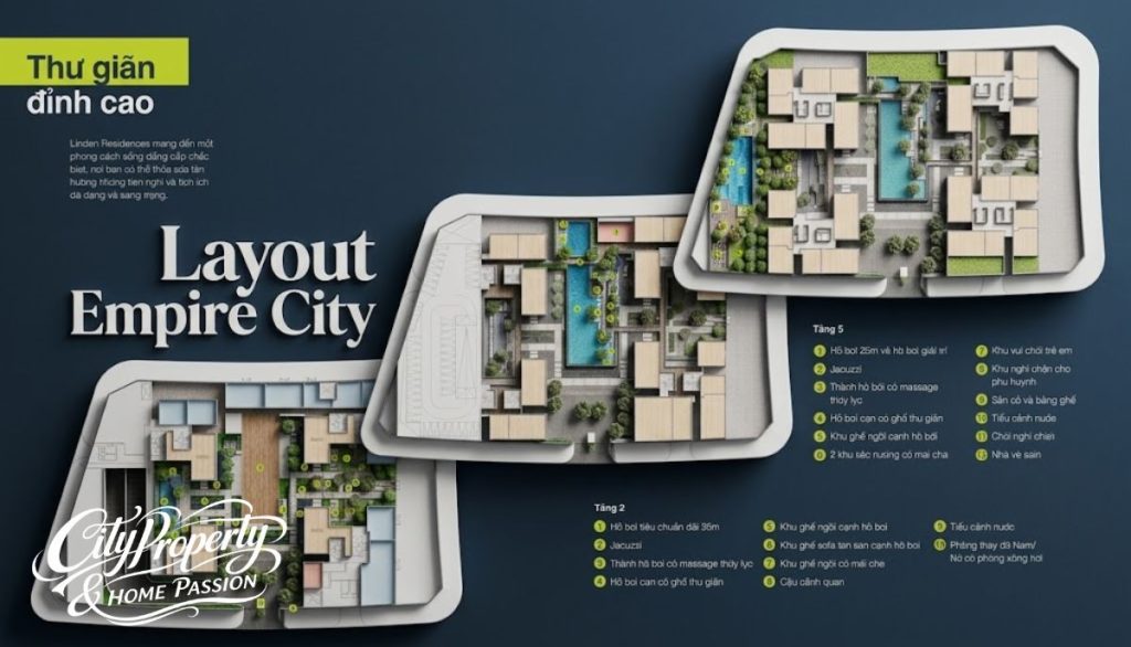 - Hệ sinh thái tiện ích: Mặt bằng empire city tích hợp hồ bơi tràn bờ tiêu chuẩn Olympic, vườn trên không và đường chạy bộ ven sông.